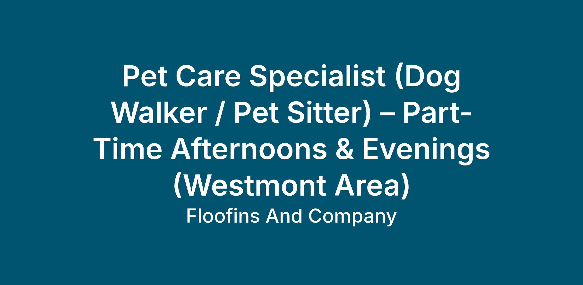 Floofins & Company is a family-owned, professional dog walking and pet-sitting company serving Westmont, Clarendon Hills, Hinsdale and surrounding communities. We are hiring a part-time Pet Care Specialist to join our afternoon and evening team.